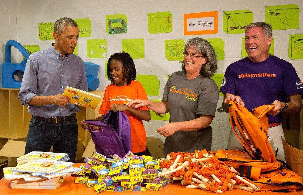 The President and First Lady were at the Inspire School in Northeast Washington, D.C., to stuff backpacks, which were filled with books, chalk, and other items to encourage outdoor play. The packs will be distributed to homeless children at a nearby shelter as birthday gifts. Both of the Obamas were thoroughly amused by Madison’s comment.