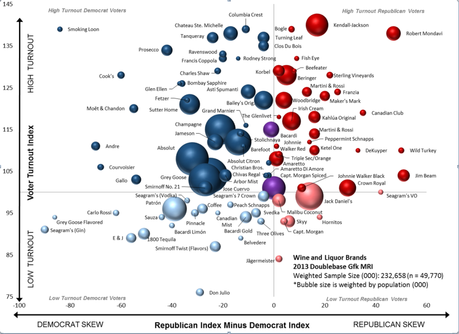 Using consumer research data, National Media charted over 50 major brands of wine and spirits according to voter registration and turnout history. The graph maps the political spectrum horizontally, from left to right, with blue and red colors denoting Democratic and Republican drink preferences, respectively. The vertical axis corresponds to turnout: selections appearing at the top of the chart are preferred by those who are most likely to vote, the bottom are least likely.