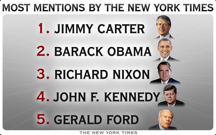 Believe it or not, it’s Jimmy Carter, who was mentioned in 9,720 articles back in 1980. First runner-up, in second place, is our current Commander in Chief, Barack Obama, during his 2012 campaign. In third place, Richard Nixon in 1973, as Watergate heated up. Coming in fourth, John F. Kennedy in 1962, the second year of his presidency. In fifth place, mentioned in 6,220 articles, was Gerald Ford in 1976.