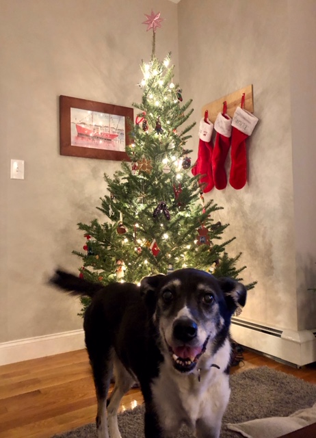 The vet said in her 16-year practice this was a first! Above is a picture taken yesterday in Boston in front of my son and his wife’s newly decorated Christmas tree. Our family has had now two Thanksgiving celebrations with this wise lady and our hope is another Christmas — 2019!! #gokayago