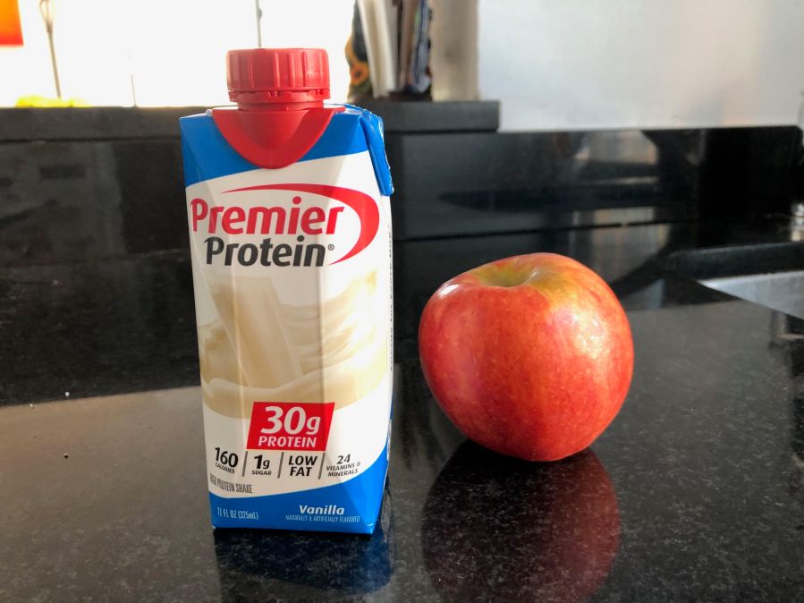 I’m not one to wolf down lunch quickly because there’s no time. I’d rather use a meal replacement when I’m on the run. That’s why my on-the-go lunch is a low-sugar, high-protein shake or bar, in addition to a whole piece of fresh fruit. I’ll often have either the bar or the shake with the fruit, and if I need a late afternoon snack, I can eat the other item. The shake is quicker and has more protein, but often I like to have the feeling of chewing while I’m eating!