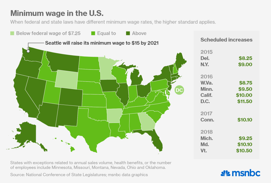 In New York City, city lawmakers are considering hiking minimum wage to $15 an hour for businesses with yearly sales of $50 million or more. It will be a tough battle for a city with a strong business lobby: just three years ago, when the minimum wage was just $7.25 an hour, a heated lobbying battle chipped away at Democrats efforts to pass a “living wage” bill in the city at wages as high as $20 an hour. By the time the bill passed, it was estimated to only affect 600 workers of the city’s minimum wage workers, hiking their wages to $10 or $11.50 an hour depending on benefits.