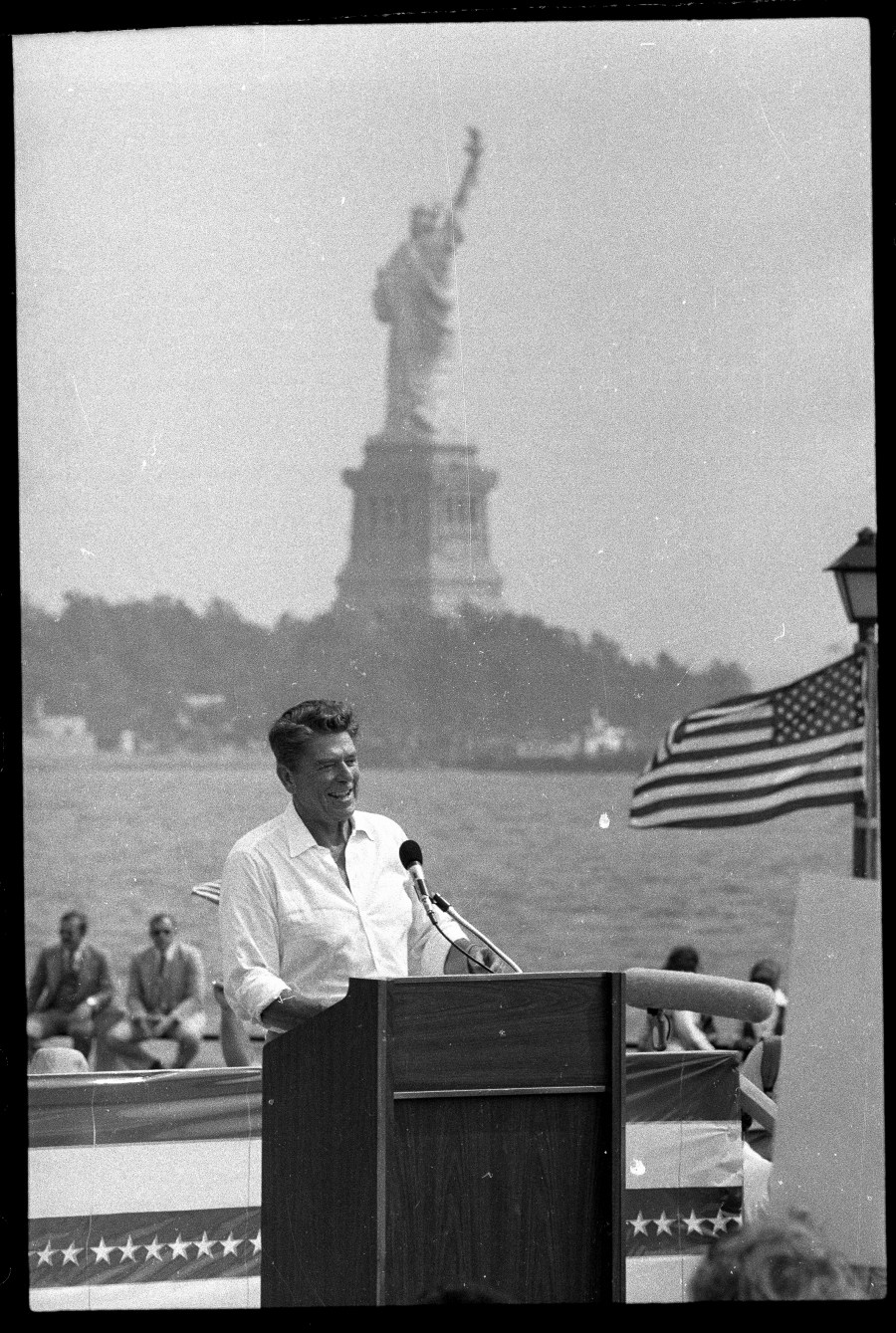 Here, Reagan launches his 1980 campaign with the Statue of Liberty as his backdrop.