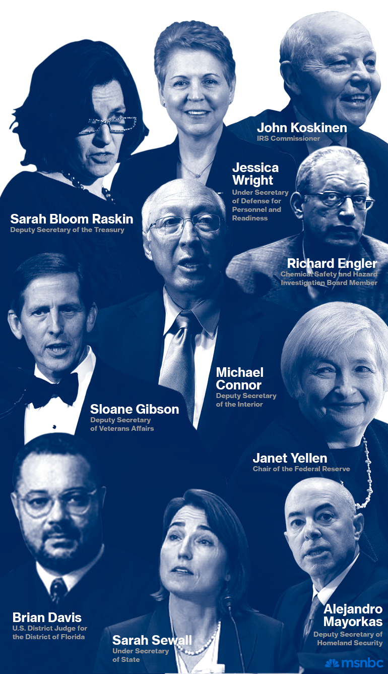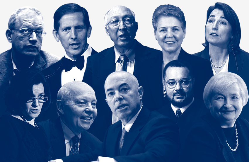 Photo Illustration by Meagan Choi; Connor: AP Photo/Jeff Chiu; Engler: Center for Effective Government/YouTube; Davis: Courtesy Nassau County Clerk; Gibson: Kris Connor/Getty Images; Koskinen: AP Photo/J. Scott Applewhite; Mayorkas: AP Photo/J. Scott Applewhite; Raskin: REUTERS/Brian Snyder; Sewall: Courtesy of CSPAN; Wright: Courtesy of Department of Defense; Yellen: REUTERS/Joshua Roberts