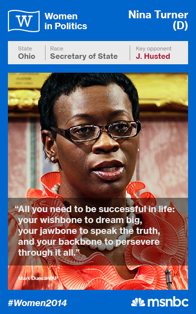 Here’s the deal: Turner, the minority whip for the Ohio senate and state senator for the state’s 25th district, has campaigned heavily on voting rights during her race for secretary of state against Republican Jon Husted. Turner launched the “Meet me at the Box” program this summer to stress early voting to Ohioans — she has previously called the GOP’s attempt to cut back early voting “immoral.” Turner would be the first African-American candidate elected to a statewide office. A July poll showed Turner and Husted neck and neck.