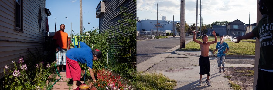 (left) Ronnie Downing, who was let go from his job at the Revel Casino Hotel, tends to his back garden along with his wife, while (right) a group of kids and adults have an afternoon water fight in Atlantic City on Aug. 28th, 2014.