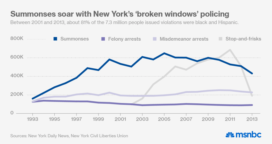 According to the NYCLU report and an analysis by the New York Daily News, 81% of the 7.3 million people slapped with low-level summonses between 2001 and 2013 were black and Hispanic. The data includes summonses spanning the whole of Michael Bloomberg’s mayoral term, a period when New York City ramped up an aggressive police campaign in poor, mostly minority communities. Critics of Broken Windows say that countless millions of dollars have been spent on targeting minority and low-income neighborhoods for petty crimes — even while crime by many measures is at an all-time low.