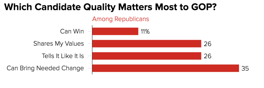 Republicans said they cared most about change, blunt talk and values when choosing their candidate. Missing from this list? Electability, which few GOP voters ranked as a top priority.