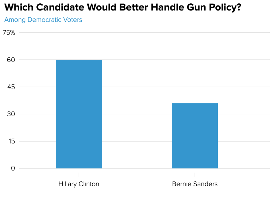 Gun control has been a major issue in the Democratic primary, with Clinton hitting Sanders over what she says is a more lax position on regulating firearms. Sanders has defended his position on gun control by referring to his home state of Vermont, which has little restriction on guns. New York voters said Clinton would be the better candidate to handle gun policy, 60 percent to 36 percent for Sanders.