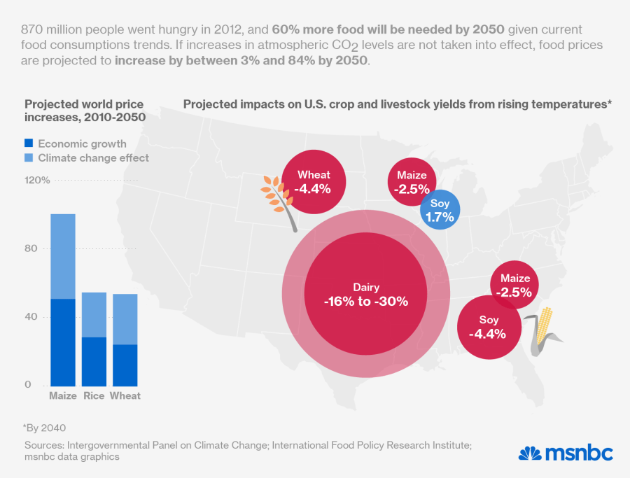 “All aspects of food security are potentially affected by climate change, including food access, utilization, and price stability,” according to the report. In other words, rising temperatures could make food scarcer, more expensive, and harder to safely keep in storage. Some staple crops may even become less nutritious or filling: “Cereals grown in elevated CO2,” according to the report, “show a decrease in protein.”