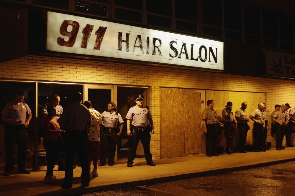 Police officers stand in position by the 911 Hair Salon as they watch demonstrators protest Michael Brown's murder, Aug. 16, 2014 in Ferguson, Mo. Missouri Governor Jay Nixon and Missouri State Highway Patrol Captain Ronald Johnson imposed a 12am curfew for demonstrators continuing to protest the the killing of Brown, who was shot and killed last week by Ferguson Police Officer Darren Wilson after being suspected in taking part in a robbery at a convenience store.