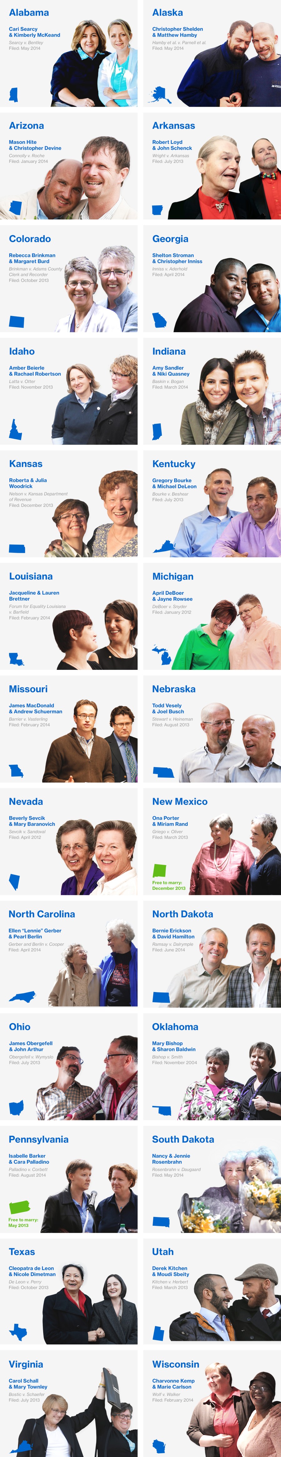 Photo credits, from left to right: Courtesy of Cari Searcy/AP; Chris Shelden/AP; courtesy of Mason Hite and Christopher Devine; Danny Johnston/AP; courtesy of Rebecca Brinkman and Margaret Burd; David Goldman/AP; Todd Dvorak/AP; Jeffrey D. Nicholls/Sun-Times Media/AP; courtesy of Roberta Woodrick and Julia Woodrick; Brett Barrouquere/AP; Janet McConnaughey/AP; Paul Sancya/AP; Orlin Wagner/AP; Nati Harnik/AP; Lambda Legal/File/AP; Russell Contreras/AP; courtesy of Ellen Gerber and Pearl Berlin; courtesy of Bernie Erickson and David Hamilton; Glenn Hartong/The Cincinnati Enquirer/AP; Brennan Linsley/AP; Matt Rourke/AP; courtesy of Nancy and Jennie Rosenbrahn; Eric Gay/AP; Rick Bowmer/AP; Steve Helber/AP; John Hart/Wisconsin State Journal/AP