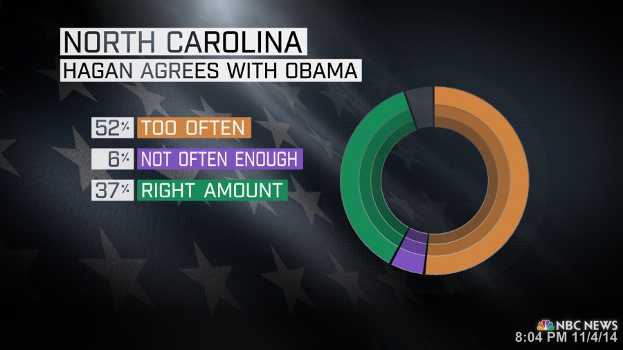 Tillis was fairly successful in tying Hagan to the president. Half of voters, 52%, feel that Hagan agrees with the president too often, just 6% feel she does not agree with him enough, and about 37% feel it is about the right amount.