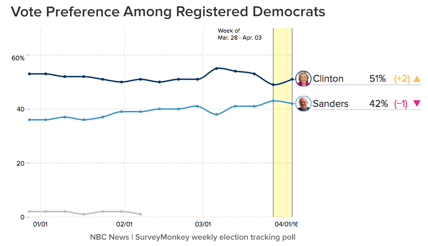The NBC News|SurveyMonkey Weekly Election Tracking poll was conducted online March 28 through April 3, 2016 among a national sample of 14,071 adults aged 18 and over, including 12,116 who say they are registered to vote. Respondents for this non-probability survey were selected from the nearly three million people who take surveys on the SurveyMonkey platform each day. Results have an error estimate of plus or minus 1.1 percentage points. For full results and methodology for this weekly tracking poll, please click here.