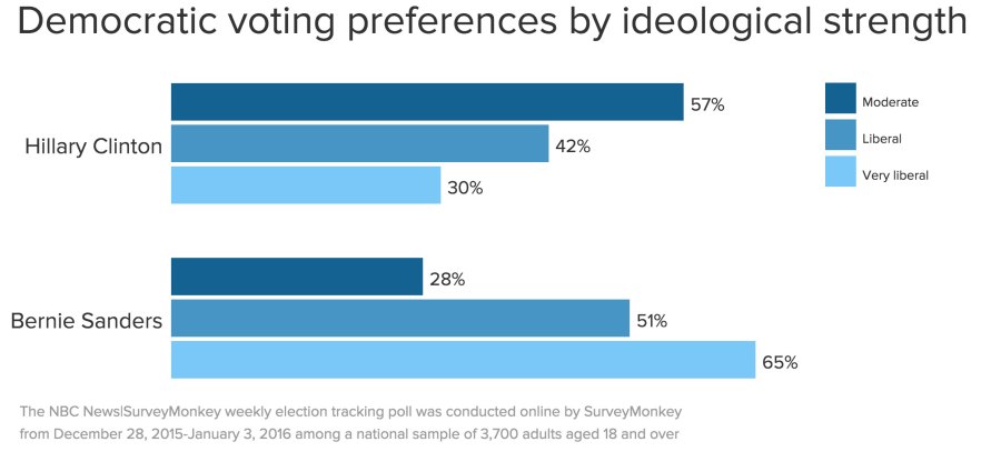 Among subgroups of Democrat or Democratic-leaning voters, Clinton gets more support from those who identify as moderate. Sanders draws more support from those who identify as liberal or very liberal.