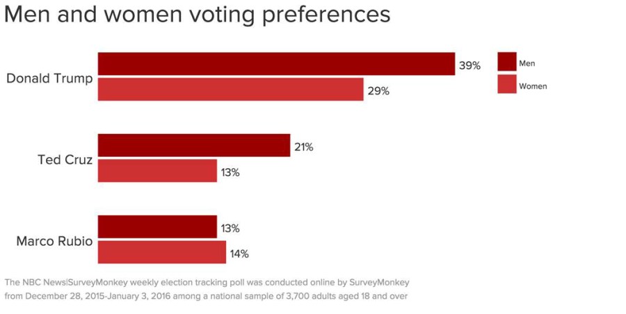 Trump leads among men with 39% support, compared to 21% of men who support Cruz and 13% of men who support Rubio. Trump also leads among women with 29% support, while Cruz and Rubio have about equal support from women—13% and 14%, respectively.