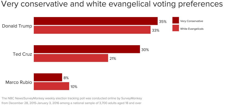 With the presidential primaries in full swing, Donald Trump maintains his sizable lead over the rest of the Republican field. Among Republican or Republican-leaning registered voters, Trump has 35% support compared to 18% for Ted Cruz and 13% for Marco Rubio, according to results from the latest NBC News|SurveyMonkey Weekly Election Tracking Poll for the week of December 28, 2015 through January 3, 2016. The poll was conducted online among a national sample of 3,700 adults aged 18 and over.
