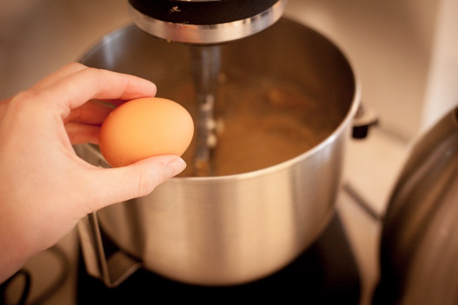 Beat in eggs one at a time and add vanilla.