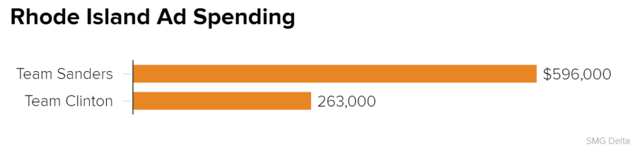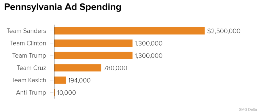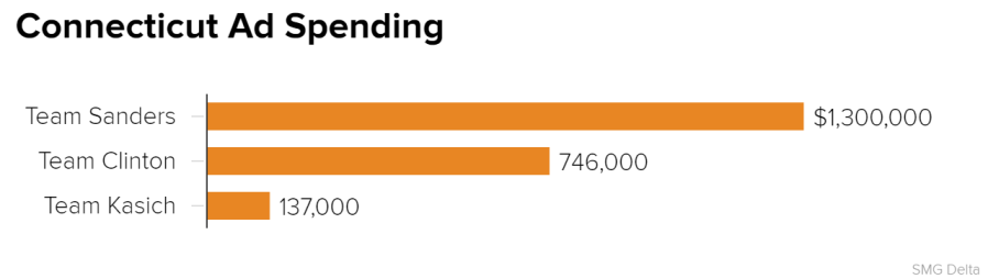 By comparison, the Clinton campaign has spent $2.4 million in those same states. (Delaware is also holding a primary on Tuesday, but it shares a media market with Pennsylvania – so it doesn’t show up in the SMG Delta numbers.)