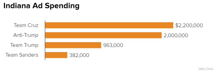 Yet looking ahead to next week’s primary in Indiana, anti-Trump forces have spent $2 million in ads, while Ted Cruz and his allies have spent an additional $2.2 million. By contrast, Trump has spent $960,000 over the airwaves in the Hoosier State.