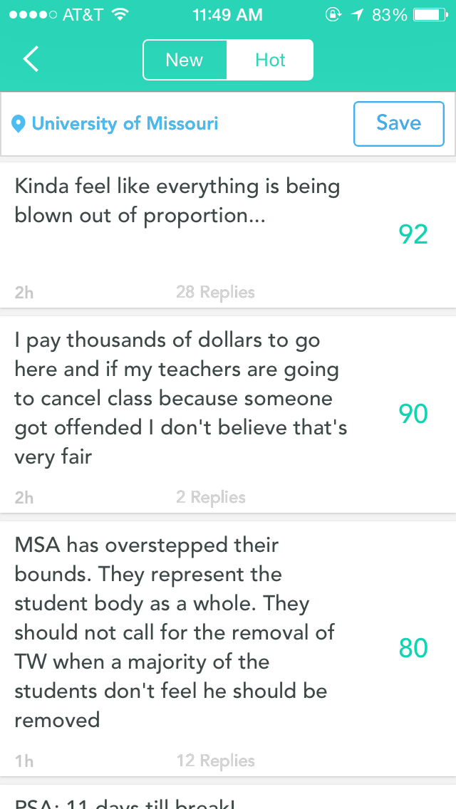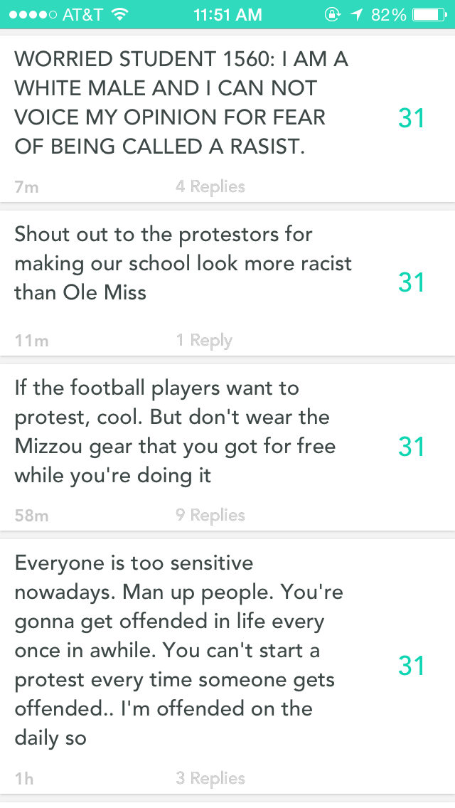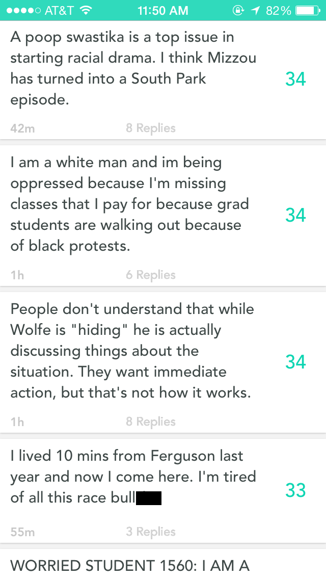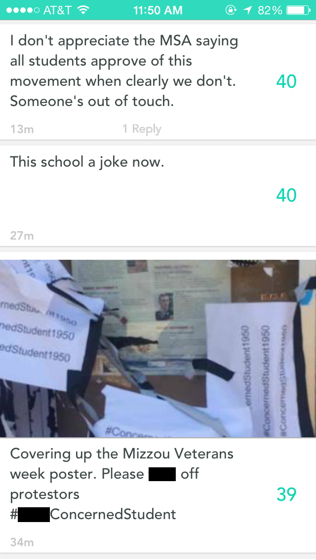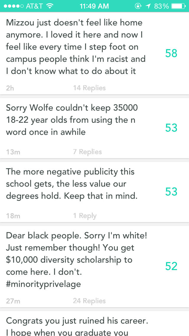 MSNBC took a look at Yik Yak, which uses geolocation to display messages in a certain area or around a certain university, and viewed messages posted by users at the University of Missouri campus. As of noon EST, these were some of the most popular messages on Yik Yak at the University of Missouri campus. Popularity is determined by users voting up or down on messages they like or dislike. The number of upvotes is displayed to the right of each message.