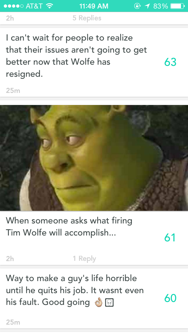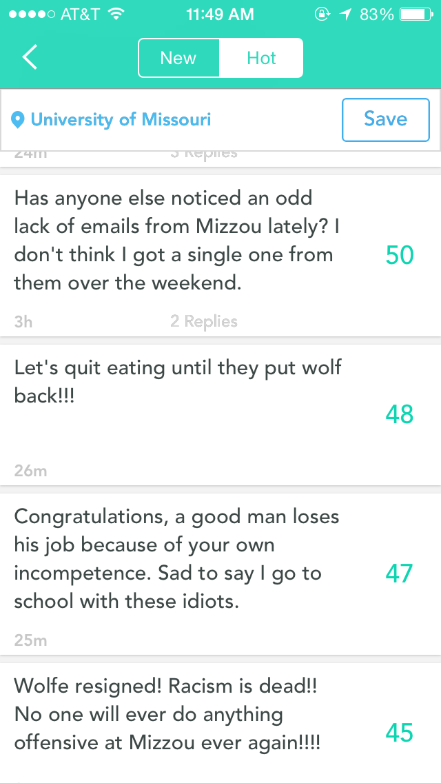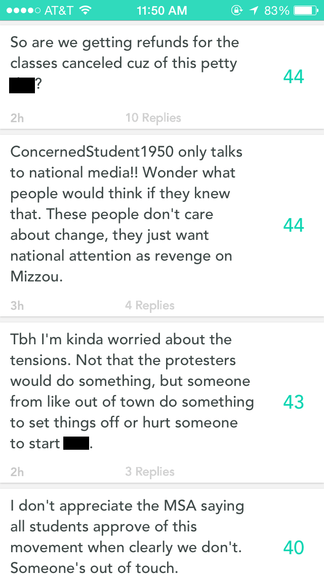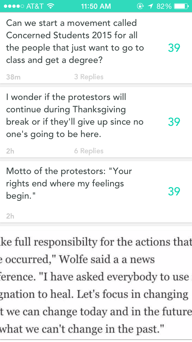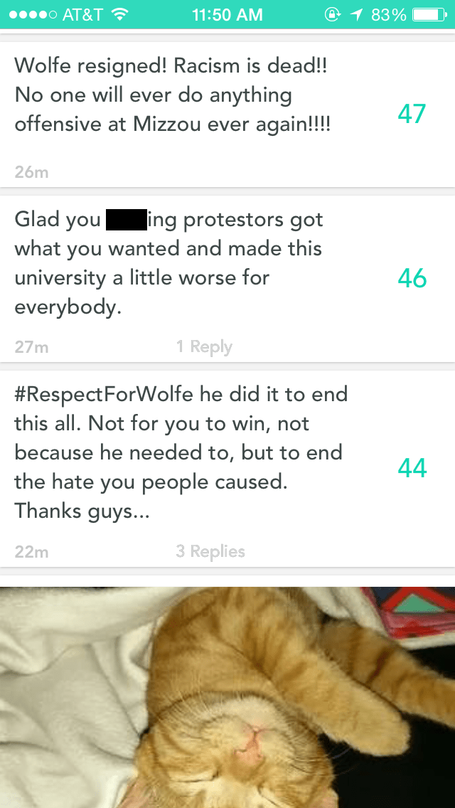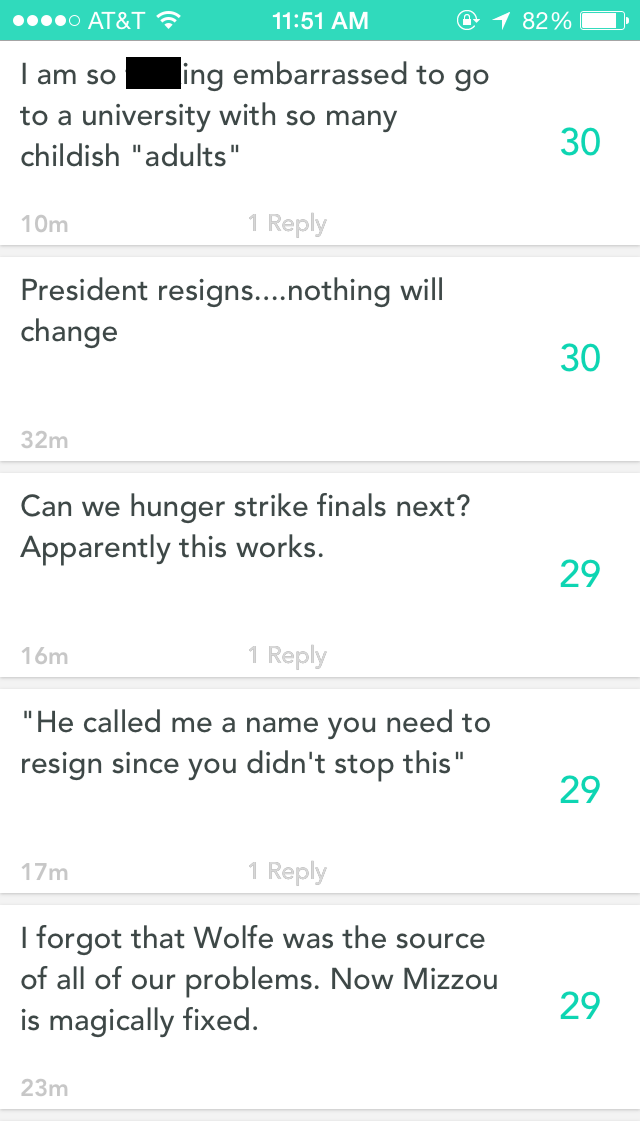 While activists and others on social media have voiced their support on Twitter for the movement and protests begun by the Mizzou students, on Yik Yak, the tone of the reactions was very different. Many students used the anonymous app to question the purpose of the protests and express anger and disappointment over Wolfe’s resignation.