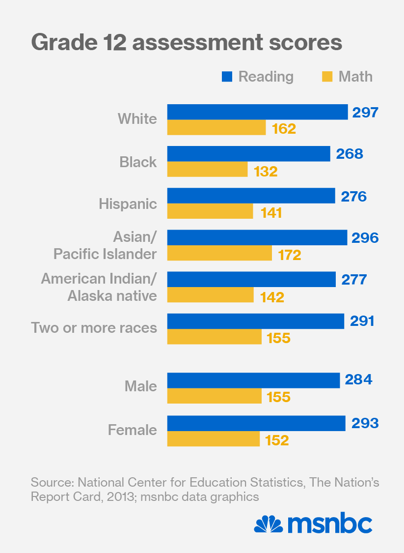 The academic performance of the nation’s 12th graders in math and reading has not changed since 2009, according to the National Assessment of Educational Progress, which on Wednesday released The Nation’s Report Card on America’s high school seniors. But the white-black gap in math and reading scores in 2013 was 30 points, the latter of which grew five points since 1992.