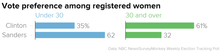 Clinton’s popularity among women does not hold true across all age groups, however. Among all registered women under age 30, 62 percent favor Sanders to Clinton. Women age 30 and older favor Clinton over Sanders by nearly 30 points.