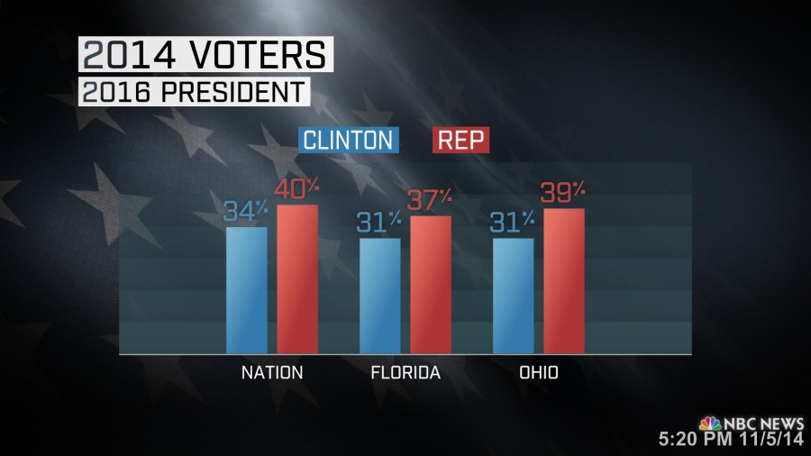Just 42% of midterm voters said Clinton would make a good president. She can take solace in the fact that this percentage is higher than for any of four potential 2016 Republican candidates also asked about in the NBC News national exit poll. Among those GOP possibilities, former Florida Gov. Jeb Bush did slightly better than others, with 29% of voters saying he would make a good president. Bush is followed by Kentucky Sen. Rand Paul at 26%, New Jersey Gov. Chris Christie at 24% and Texas Gov. Rick Perry at 24%.