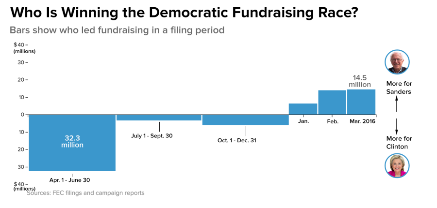 After Hillary Clinton’s dominant fundraising haul over the summer and fall, the tables have turned in the race to gain more donor support. For three consecutive months, Bernie Sanders has out-raised Clinton, with the most recent month being his largest margin yet. The Sanders campaign announced on April 1 it raised $44 million in March, to Clinton’s 29.5 million. That said, despite taking in more fundraising dollars since the first of the year, the Sanders campaign still trails Clinton in delegates, which will determine who becomes the Democratic Party nominee. According to the NBC News Delegate Tracker, Sanders trails Clinton by 680 delegates. His campaign will need to win the remaining states by double-digit margins to narrow that gap.