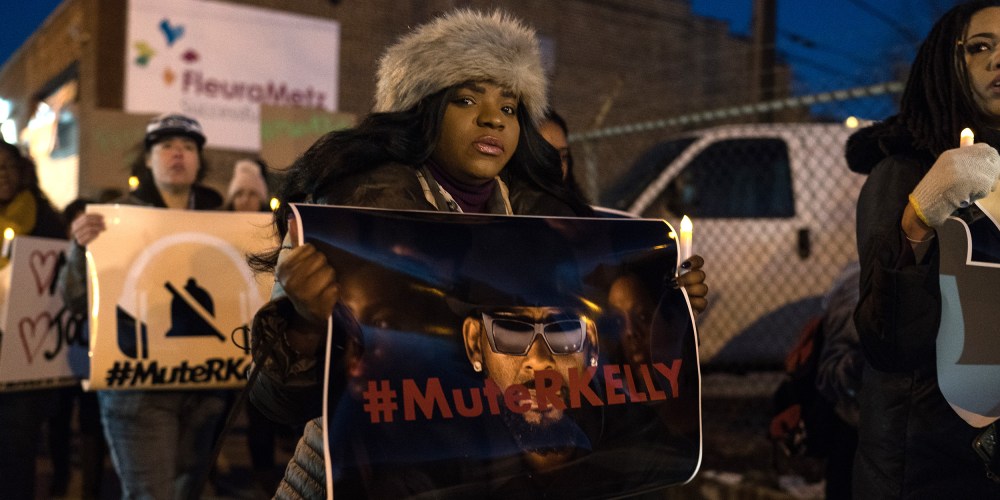 Demonstrators calling for a boycott of R.Kelly's music near his former recording studio in Chicago following the release of a Lifetime docuseries, "Surviving R. Kelly" which highlighted years of sexual abuse against young women on Jan.9, 2019.Max Herman / NurPhoto via Getty Images file