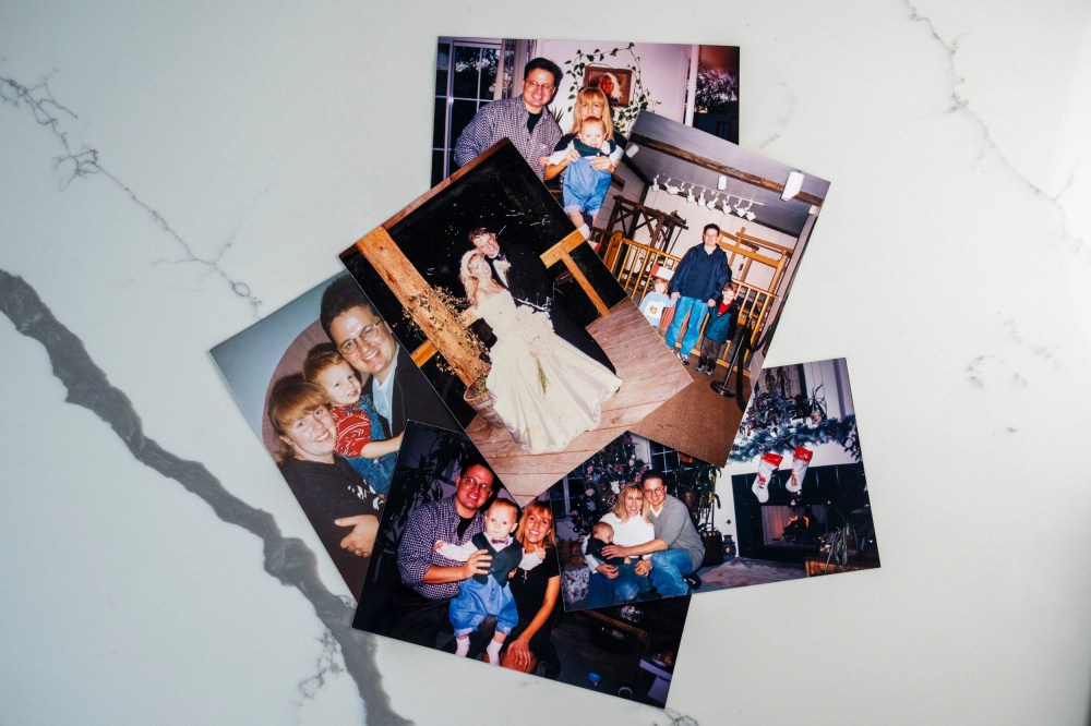 A collection of photos sits on a counter as Tasha Adams, the ex-wife of imprisoned Oath Keepers leader Stewart Rhodes, shows old family photos in Eureka, Mont., on Sept. 11, 2024.Jasper Colt / USA Today