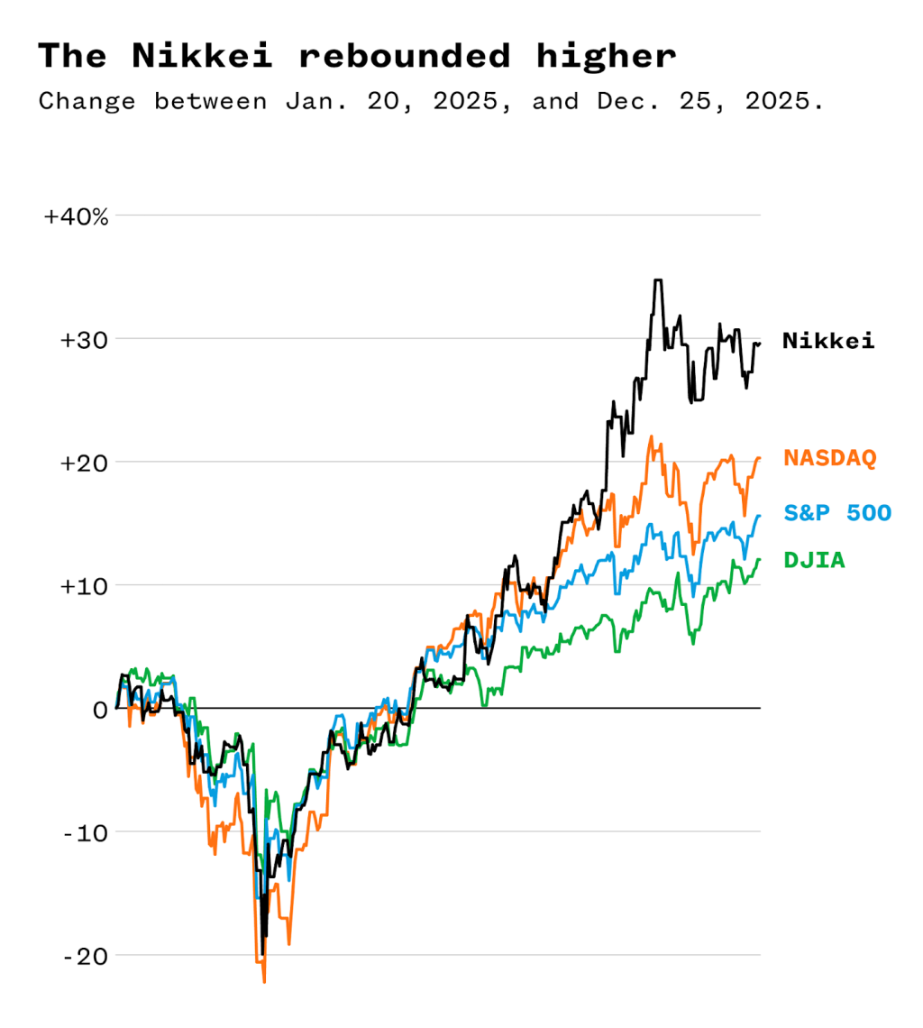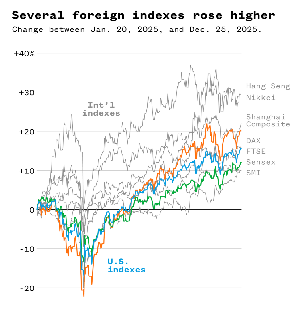 Many of the foreign indexes were also hammered when Trump announced his tariffs in April. They, too, then rebounded. Some, such as Japan’s Nikkei 225, actually rebounded higher than the U.S. indexes despite having fallen just as far after Jan. 20.