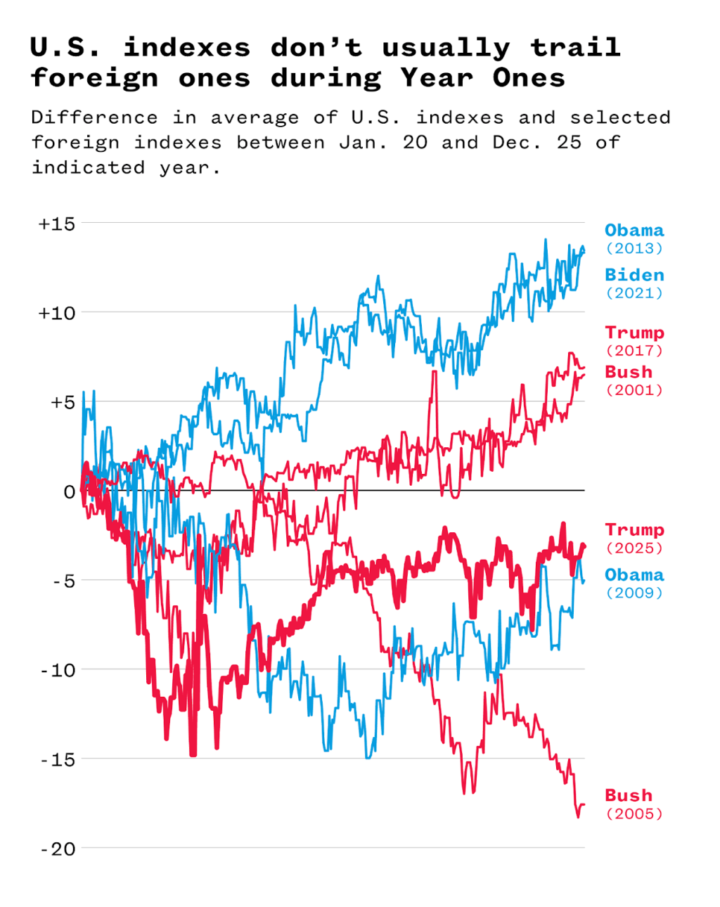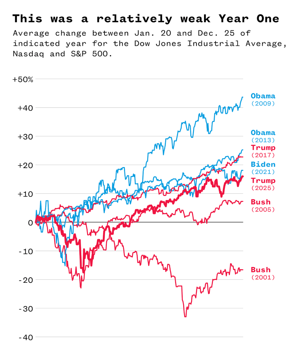 As it happens, market growth was relatively tepid for the first year of a presidential term. Since the 2001 inauguration of George W. Bush, four Year Ones have outperformed 2025, including Trump’s first Year One, in 2017. And however much Trump dislikes hearing it, there was more stock market growth by Christmas in the first year of Joe Biden’s administration than recorded during Trump’s presidency this year.