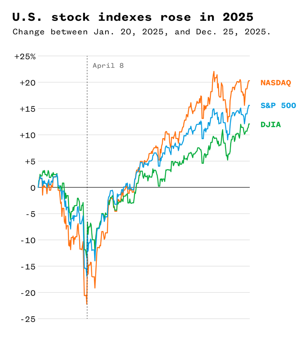 You can see why he might seize on that metric. After a post-inauguration plunge that bottomed out around the time he announced sweeping tariffs on imported products in the spring, the three major U.S. stock indexes regained their losses. The Dow, Nasdaq and S&P 500 stock indexes were all up by 10% to 20% by Christmas.