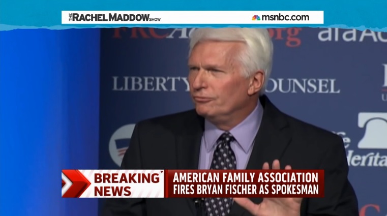 But going forward, Fischer will no longer make ugly and ridiculous comments in his capacity as a spokesperson for the AFA. Rachel reported on the show last night that the AFA has fired Bryan Fischer from his post: