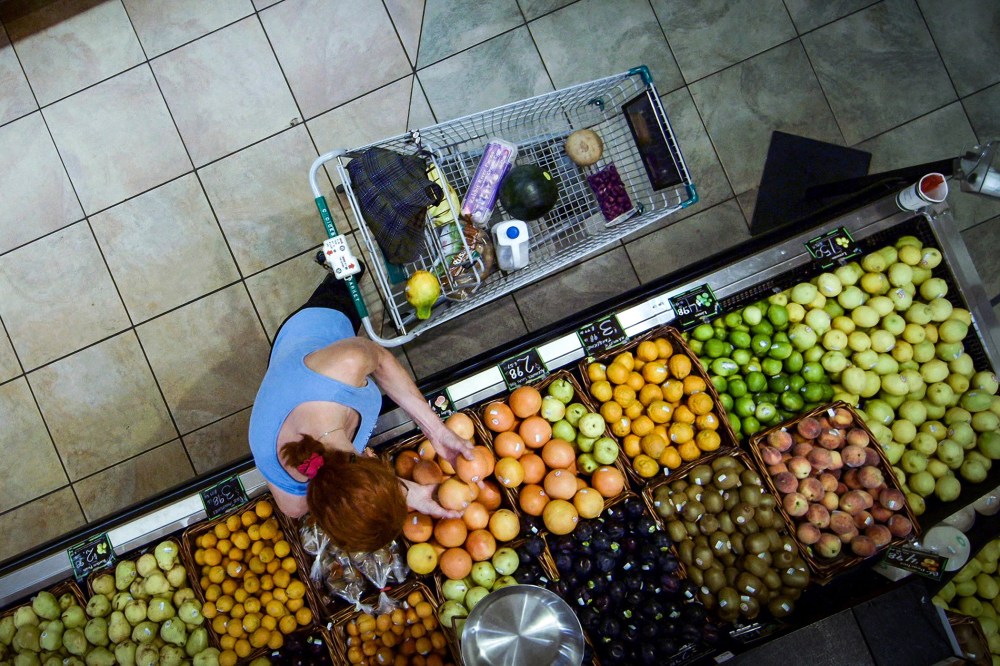 A grocery shopper picks through fruit in the produce section. Most fruits and vegetables are culled due to aesthetic issues rather than safety concerns.