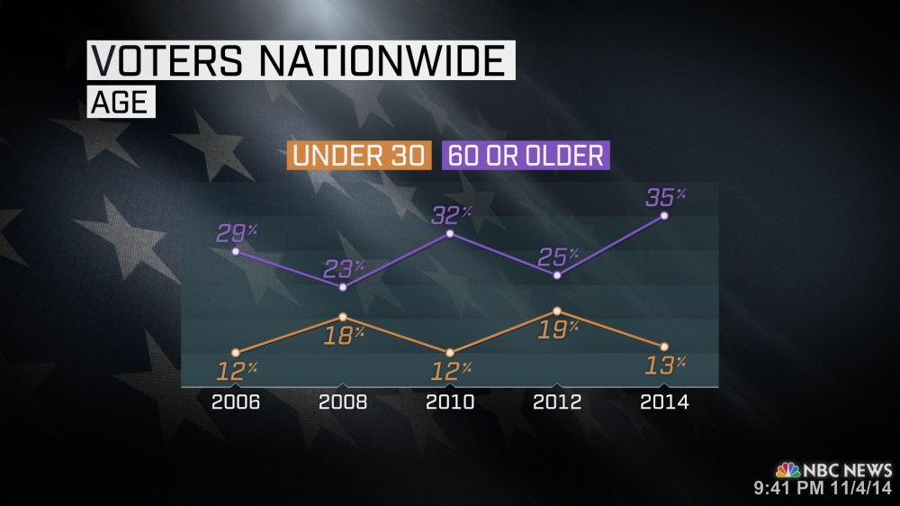 The age gap between younger voters and seniors was huge in 2010 and had a lot to do with the Republican wave election. As NBC News’ exit polls found, this was even more pronounced yesterday.
