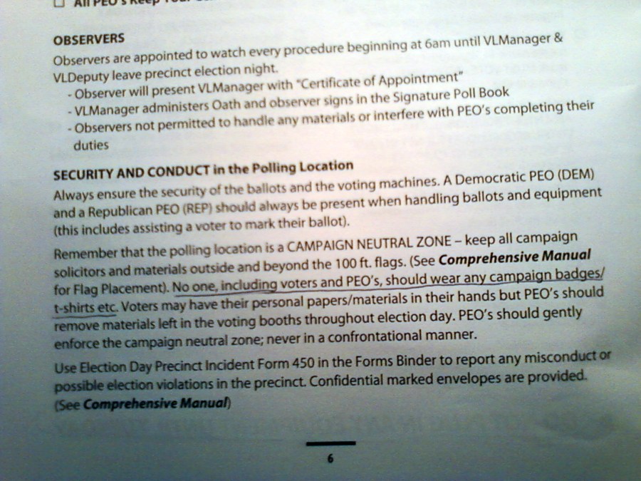 Above, you can see the poster she’s talking about. Below, the instructions for poll workers about the ban on “electioneering” in a polling place.
