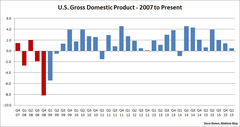 As for the image above, the chart shows GDP numbers by quarter since the Great Recession began. The red columns show the economy under the Bush administration; the blue columns show the economy under the Obama administration.