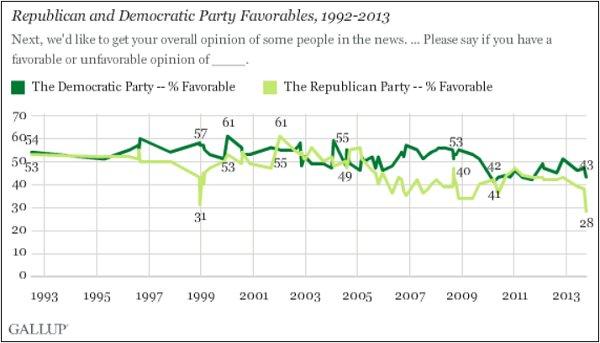 This Gallup chart shows the parties’ favorability ratings over the last 21 years, and you’ll notice that sharp drop on the right side of the image. That shows GOP support falling off a cliff.