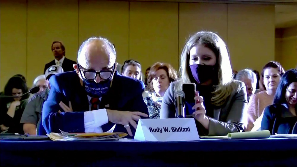 Jenna Ellis, right, and Rudy Giuliani, left, attorneys for Donald Trump, listen as Trump addresses a gathering of Pennsylvania Republican state senators via cell phone held up to a microphone in Gettysburg, PA on Wednesday, November 25, 2020.Video frame, MSNBC