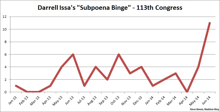 In the first five months of the year, Issa issued 10 subpoenas, for an average of two per month. In June, Issa issued 11, none of which seemed especially necessary.