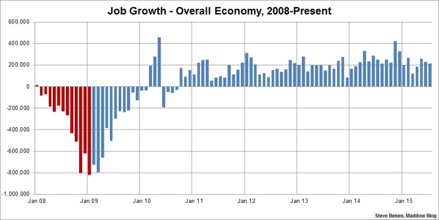 I can appreciate why job totals like these seem a little dull. Lately, it seems most monthly reports on jobs show roughly the same thing: growth around +200k and low unemployment. But let’s not take good news for granted, because it wasn’t that long ago that the country was desperate for news like this. What’s ho-hum in August 2015 would have produced dancing in the streets in August 2009.