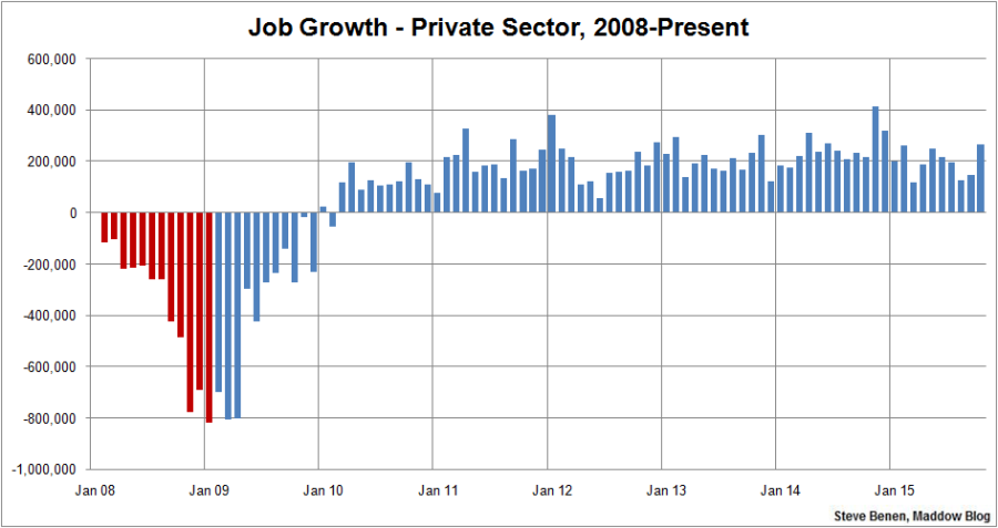 Above you’ll find the chart I run every month, showing monthly job losses since the start of the Great Recession. The image makes a distinction – red columns point to monthly job totals under the Bush administration, while blue columns point to job totals under the Obama administration.