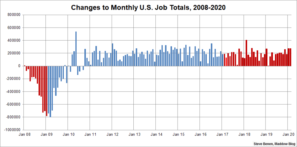 The good news is, this latest jobs report looks terrific. Indeed, between January and February, these are the best back-to-back months for job creation since 2016. The bad news is, the new report doesn’t fully reflect the effect the coronavirus outbreak has had on the domestic economy. As the Wall Street Journal reported overnight, “The coronavirus outbreak likely had minimal impact, if any, on the U.S. job market in February. Companies by and large were surveyed about their employee head count before the virus became an escalating U.S. concern.”