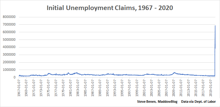 But as we’ve discussed, looking at historical data, we know what things look like when there’s an economic crisis. In early 2009, for example, near the height of the Great Recession, initial jobless claims reached 665,000 — roughly triple the totals from, say, a couple of months ago. During the U.S. recession in 1982, the number was a little higher, reaching nearly 700,000.