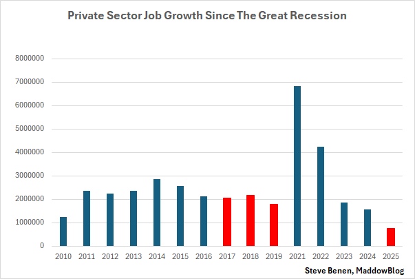 To help contextualize matters, I put together a new chart showing private-sector job growth by year since the Great Recession — excluding 2020, when the Covid-19 pandemic wreaked havoc on the job market — with data by way of the Labor Department’s Bureau of Labor Statistics. The red columns show the years in which Trump was in the White House, while the blue columns reflect Barack Obama’s and Joe Biden’s terms.