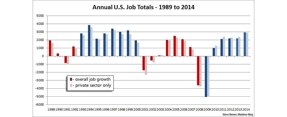 Notice, 2014 isn’t just an encouraging year as compared to other years in the Great Recession era; it’s actually a strong year on its own. Indeed, more jobs have been created this year than in any year of the Bush/Cheney era — or the Bush/Quayle era, for that matter.