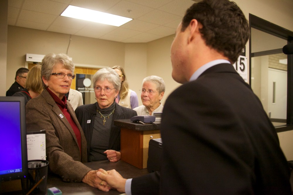 Brenda Clark (left) and Carol McCrory making their fifth request for a marriage license